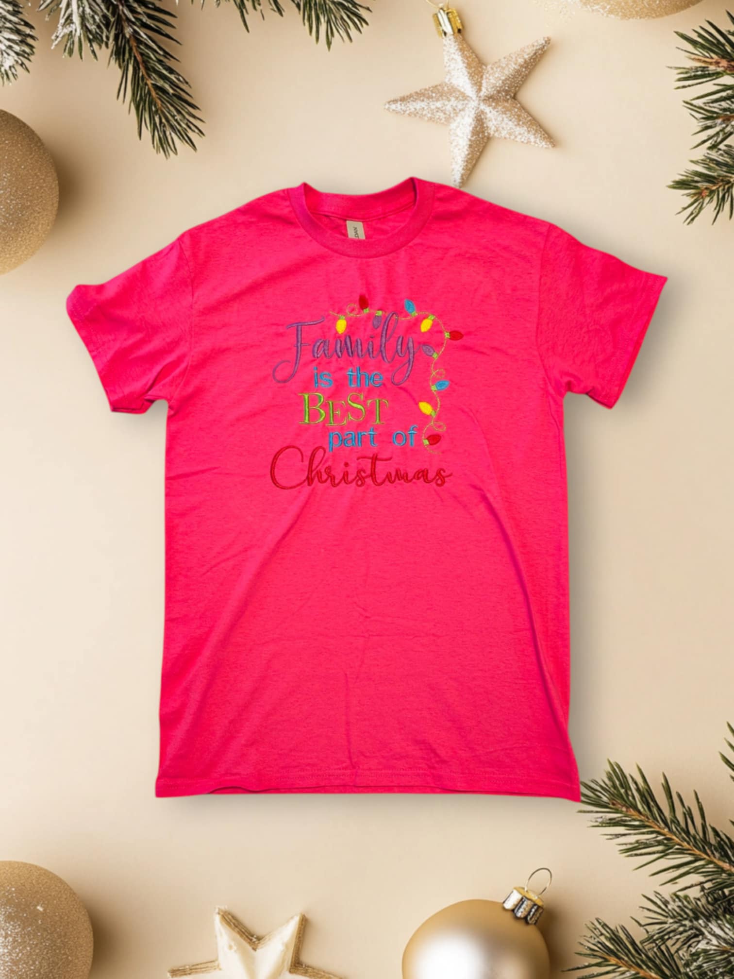 Celebrate the true spirit of the season with our festive “Family is the Best Part of Christmas” embroidered t-shirt. Featuring a beautiful embroidery design of the heartfelt saying surrounded by cheerful Christmas lights, this tee is the perfect blend of comfort and holiday cheer.